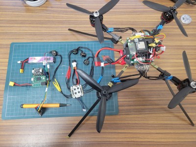 右はテストベッド1号機.火星で使えるセンサーだけを使った姿勢,高度制御を組み込んで室内でホバリングできます.制御器は試行錯誤的にチューニングしました.左は少し改良した2号機のアビオ一式.ESCは回転数を計測できる買い物です.これからエアフレームに搭載します.